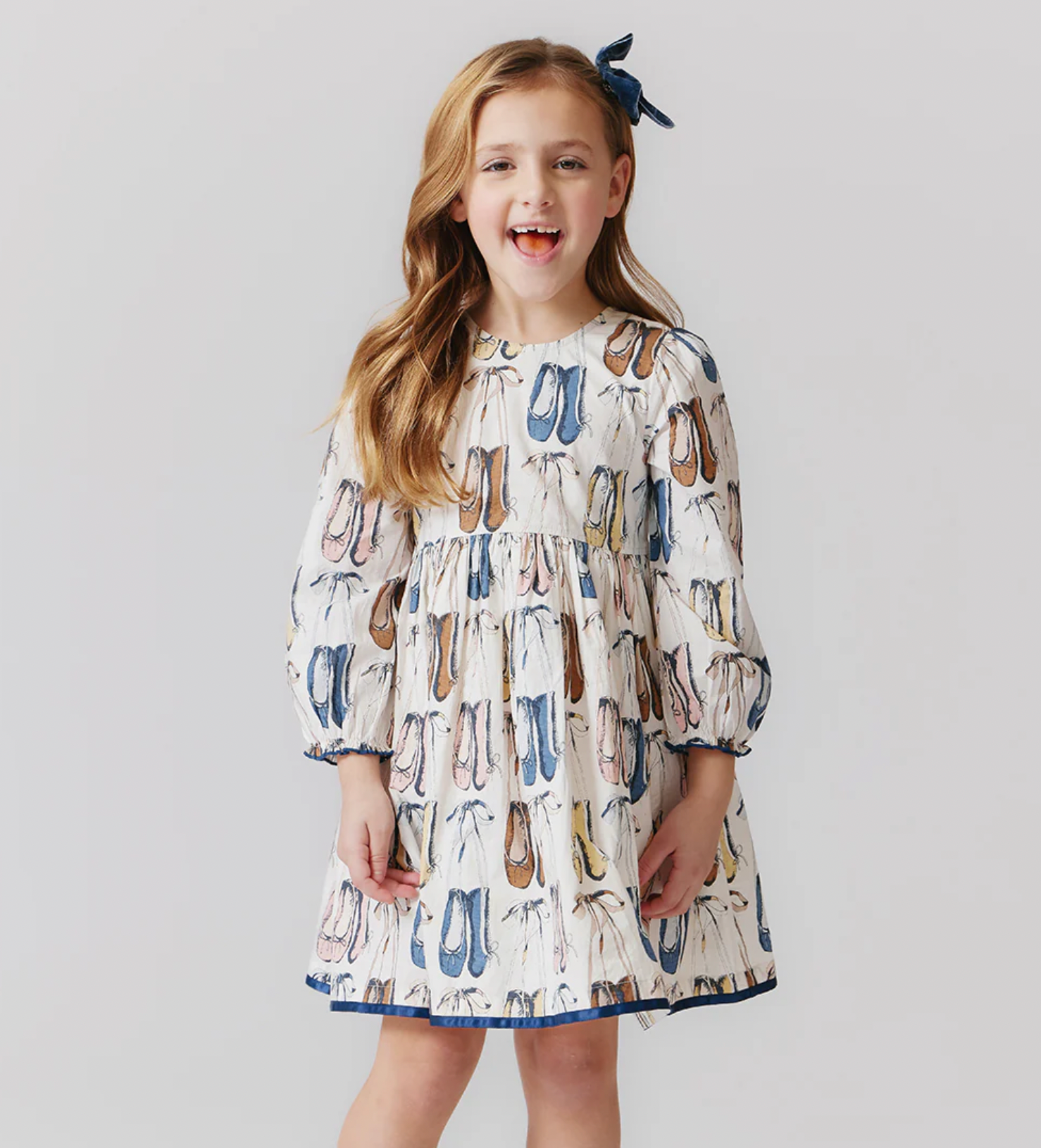 This gorgeous dress features a cool palette of toe shoes across a crisp white background, a fully gathered skirt trimmed with blue satin ribbon, a crewneck that dips slightly lower in the back and blue ruffle cuff detail at the sleeve. Zipper back closure.