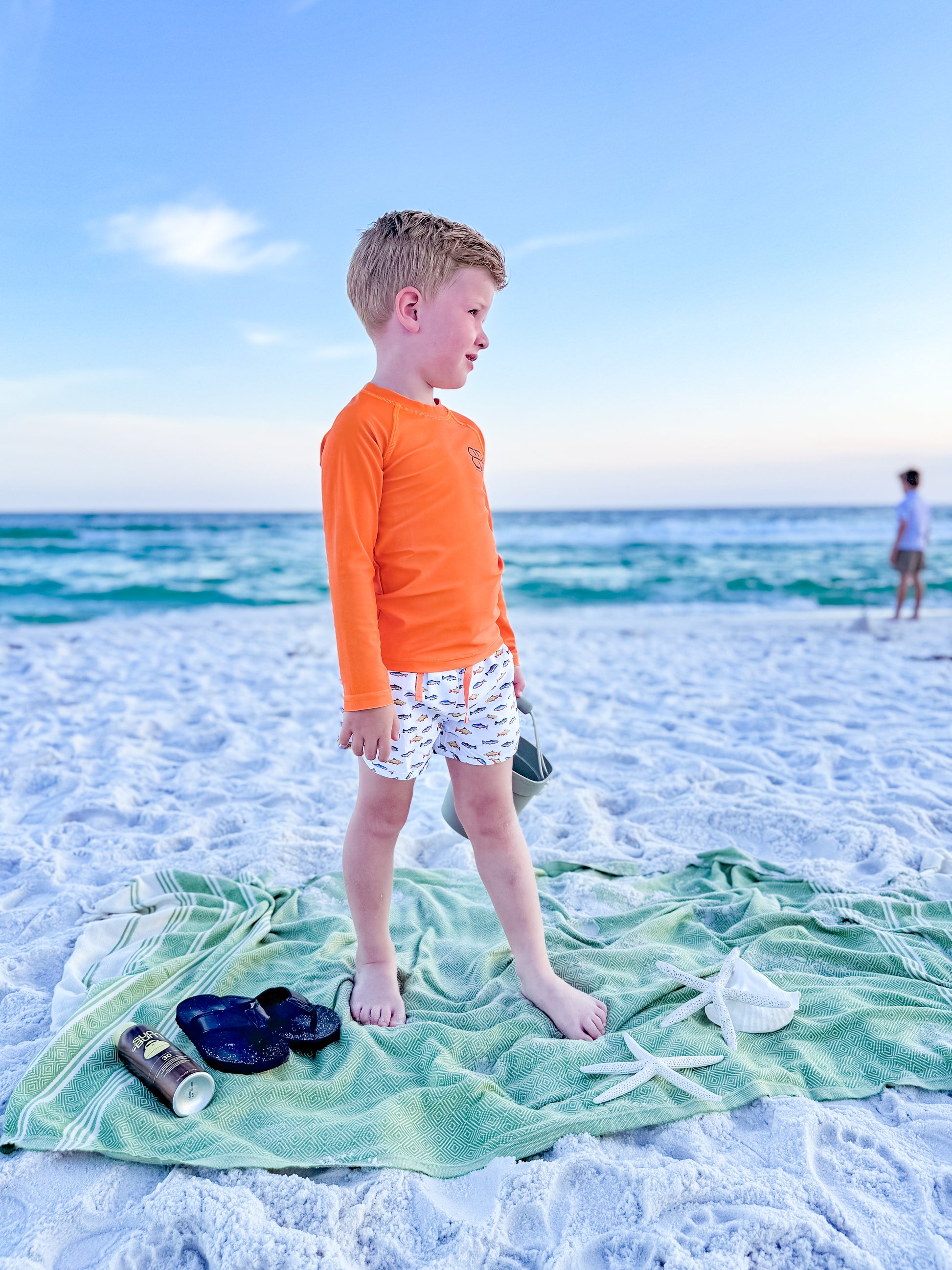 Keep skin safe with UPF 50 fabric. Featuring the Buck Brothers brand logo in navy, this rash guard blends style and sun protection. Pair it effortlessly with our Jackson Swim Shortie for a coordinated look. Available in sizes from 0-3 months to 8 years old, this ensemble ensures both comfort and sun-conscious play!