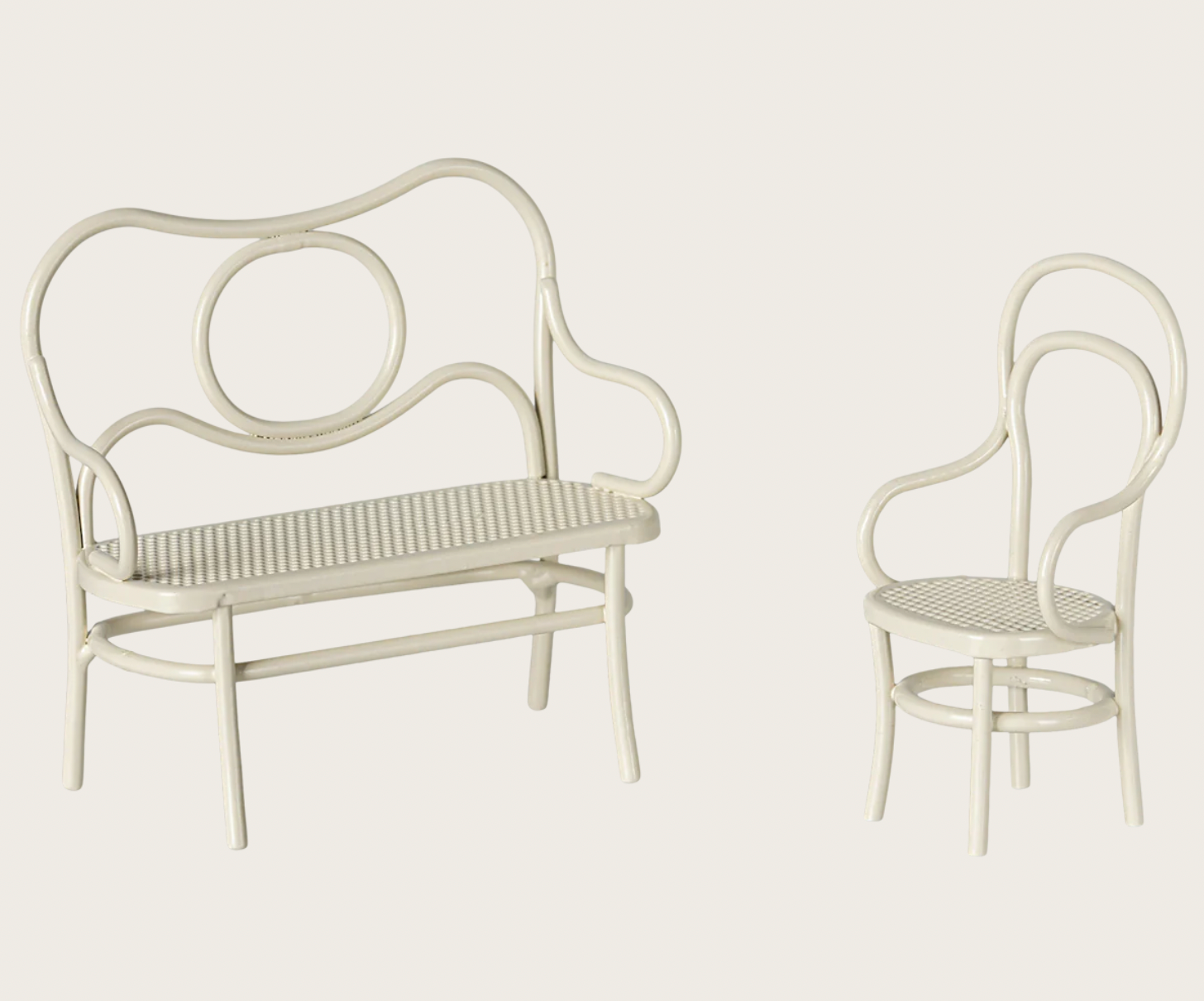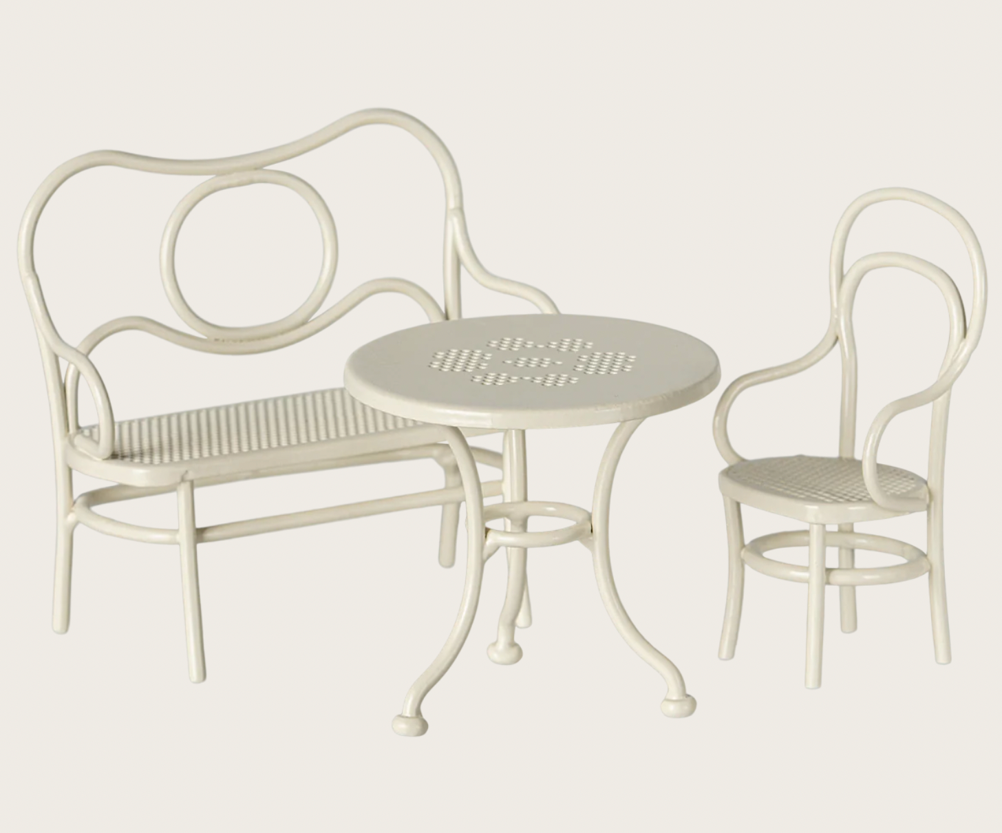 Café set furniture that fits the Little sister/brother and Big sister/brother mice. The set consist of a bench, a chair and a table, and is a perfect place for enjoying the afternoon sweets.