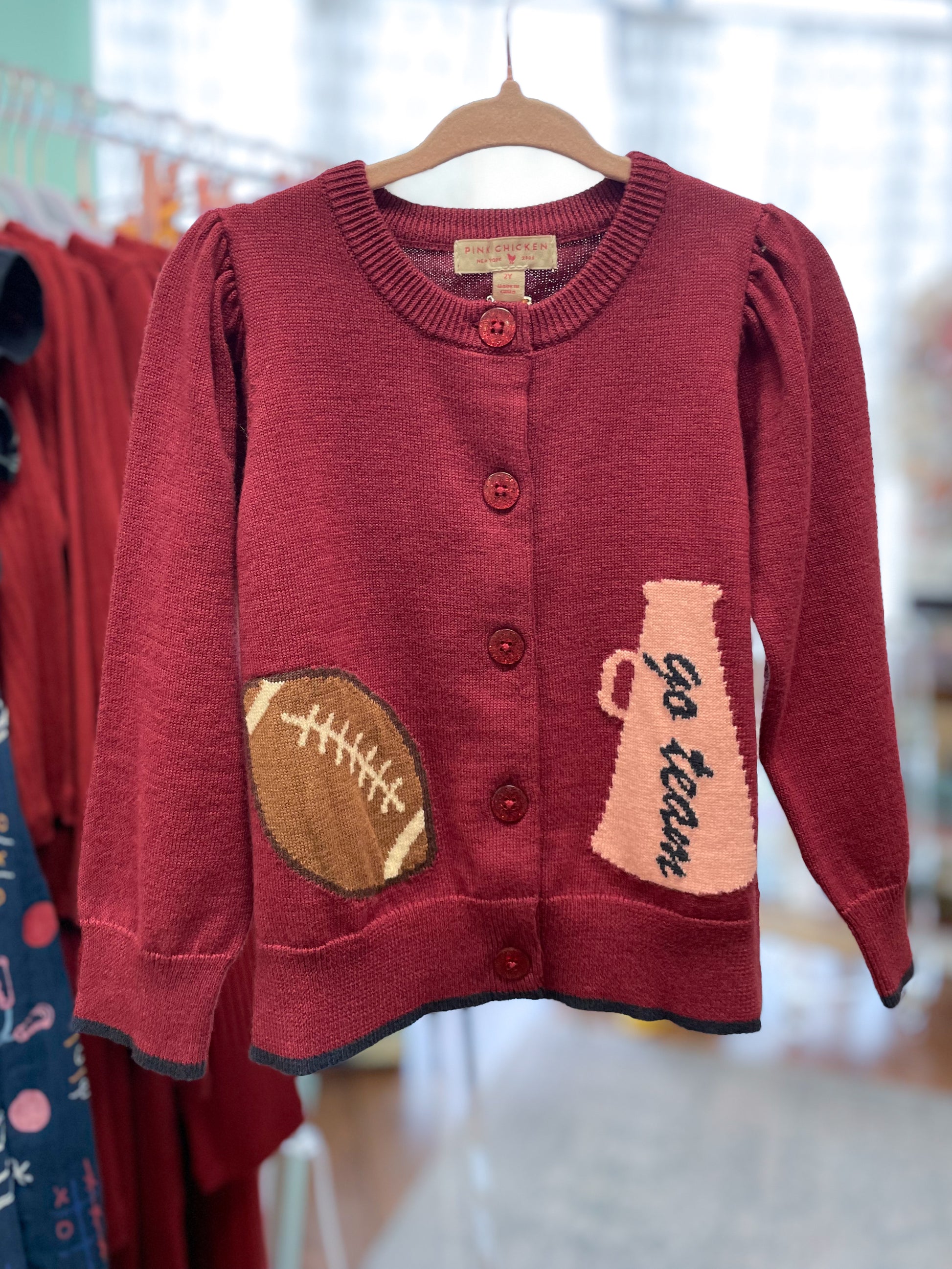 Details to love: burgundy glitter buttons, navy tipping, antargia graphics for go team and football