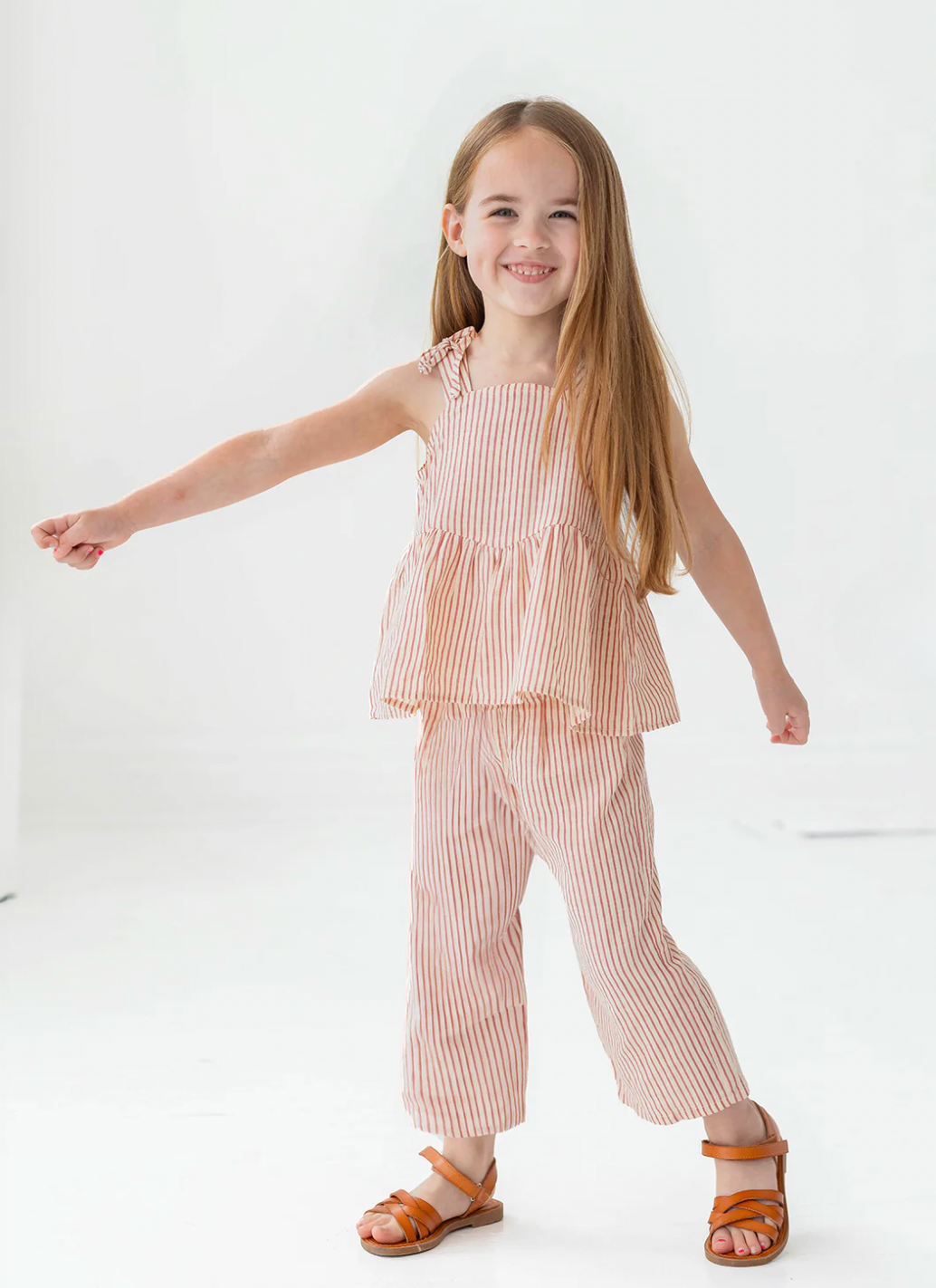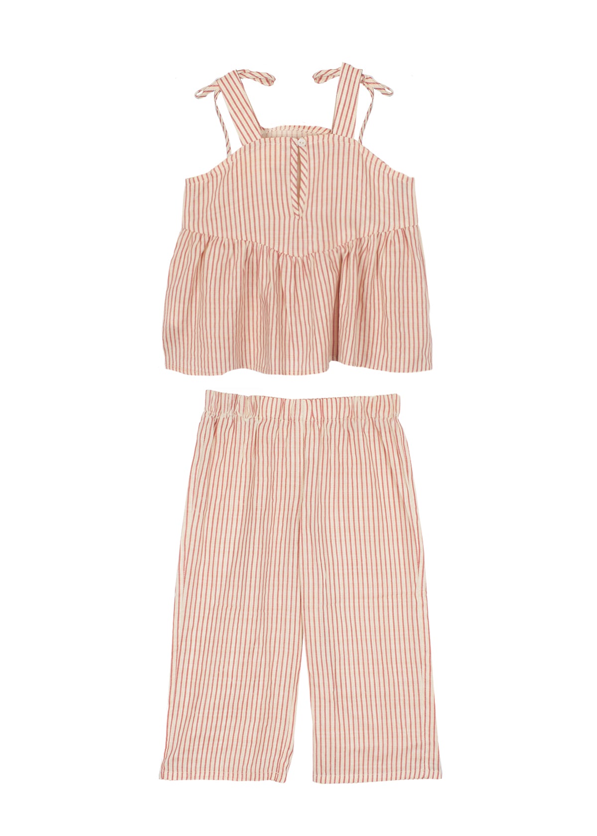 This girls' two piece set has a subtle red stripe on a natural background with a sleeveless top and coordinating wide-leg pants. The top has adjustable tie straps and the elastic waistband on the pants ensures comfort.