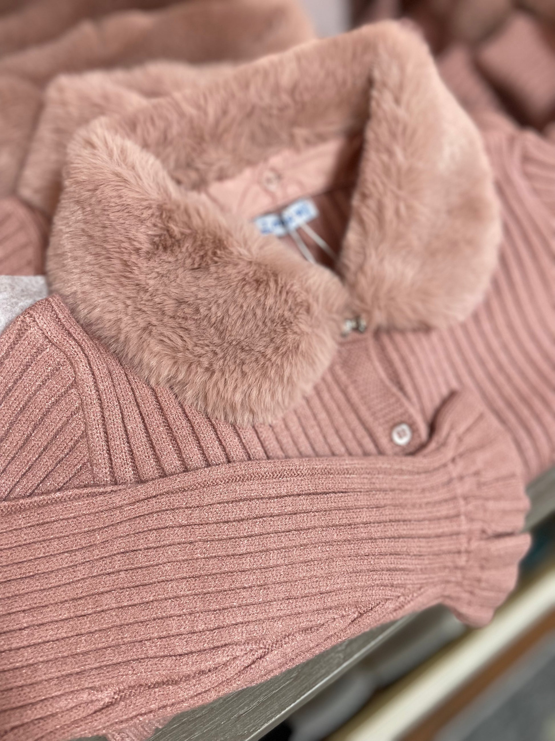 It's fabulous and functional. Super soft, with a removable faux fur collar, this cardigan is able to be dressed up or down. Sizes 5 and up also feature a beautiful little silver bow button with a little faux diamond in the center.