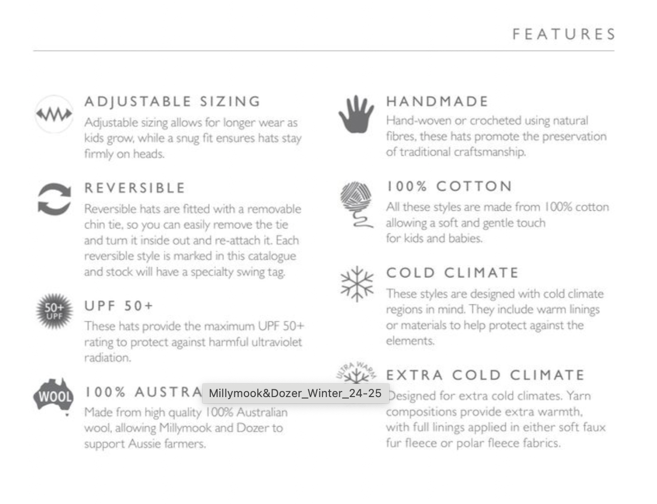 Millymook and Dozer is an Australian brand with a passion for outdoor adventure and being geared up to enjoy it! Their hats have different features and materials depending on the intended activity. We love their attention to detail and materials!