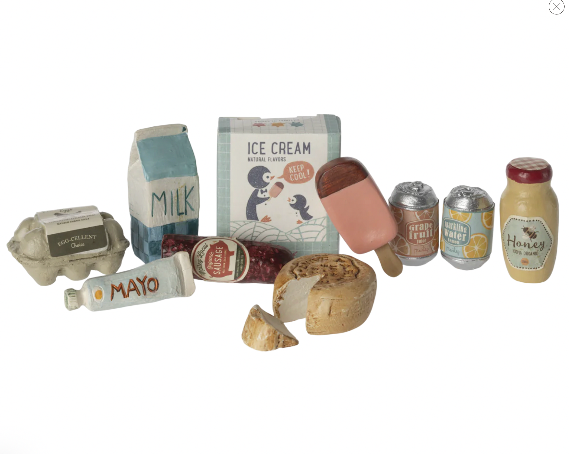 All the food your Maileg friend needs. This selection of food includes mayo, milk, honey jar, sausage, 4 ice cream sticks, egg cartons, 2 soda cans and cheese. It comes in a cardboard box. Small variations may occur in the painting.