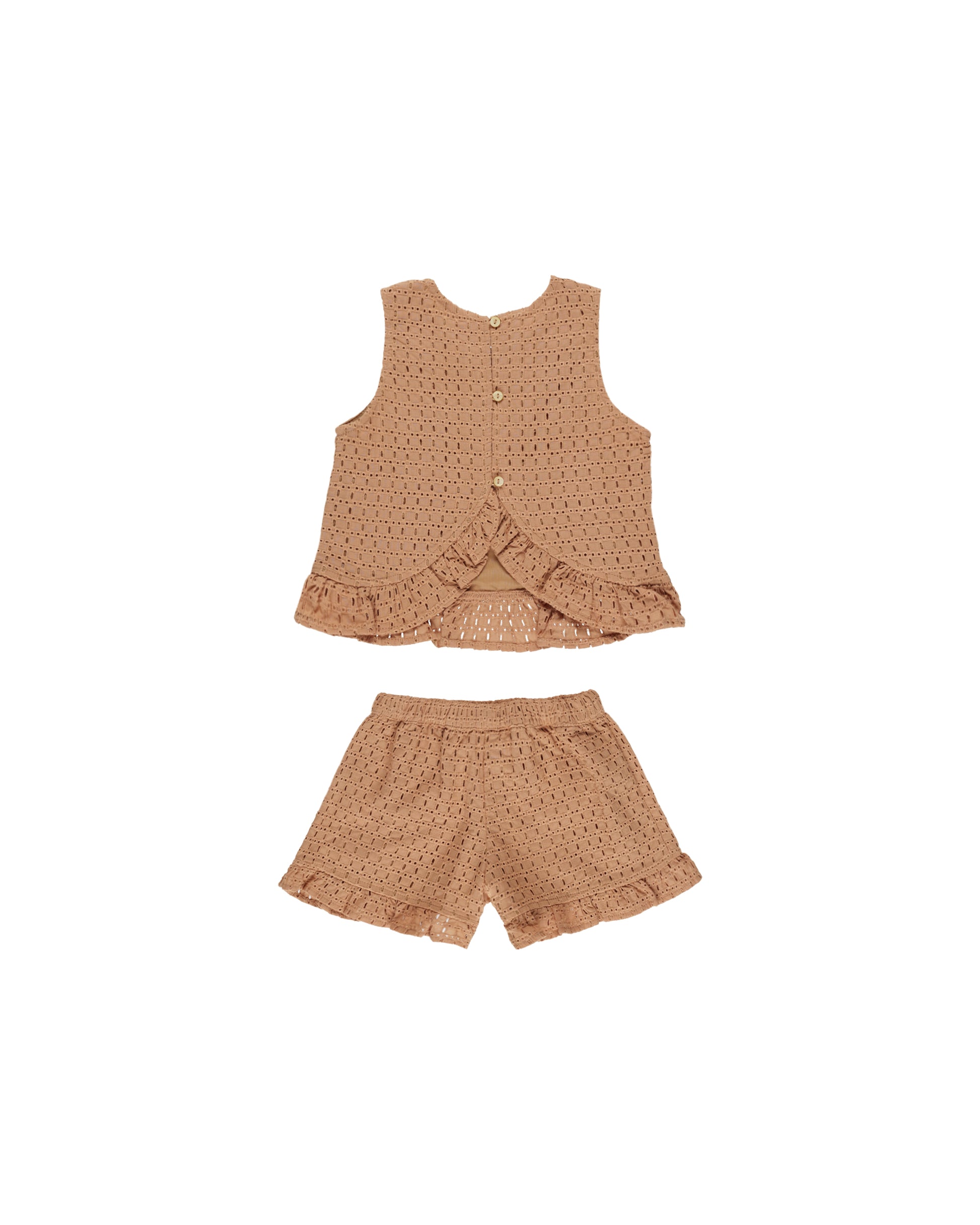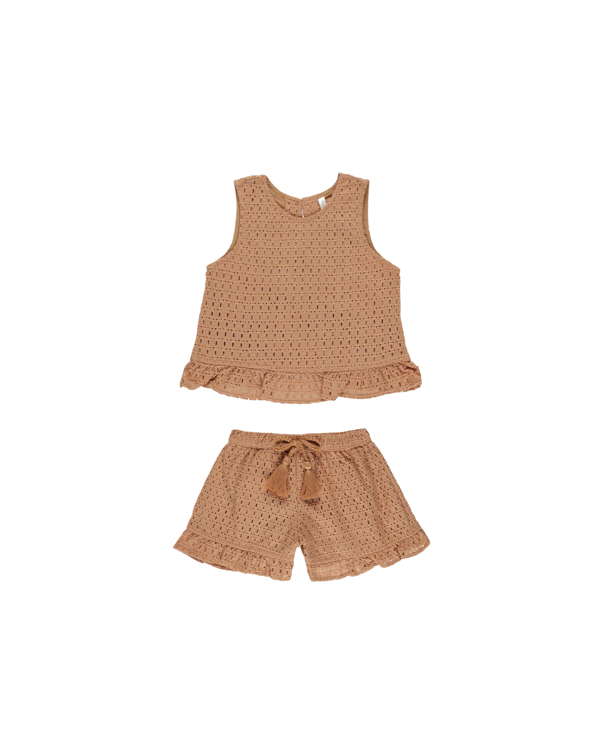 This eyelet set features a sleeveless ruffled cropped top with an open button back and coordinating ruffle shorts with an elastic waistband and decorative rope and tassel.