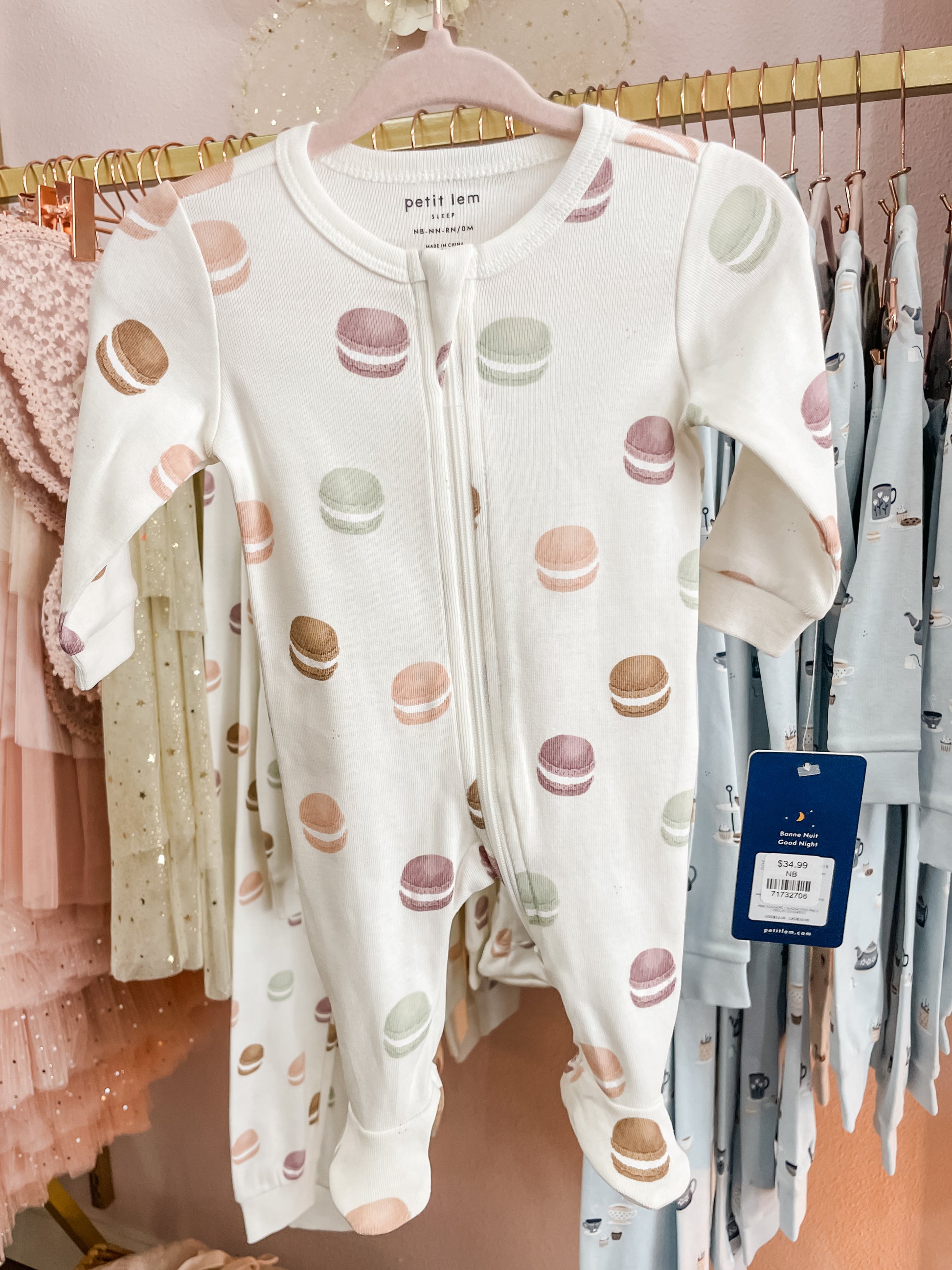 This sweet Macaron print sleeper is perfect for snuggly nights and lazy mornings. Made from the coziest organically grown cotton rib, it’s soft and gentle on her delicate skin. The integrated feet and ribbed cuffs keep her snug, while the two-way zip with a fabric guard makes changing a breeze. There’s matching PJs for older siblings, making them the sweetest pair in the patisserie.