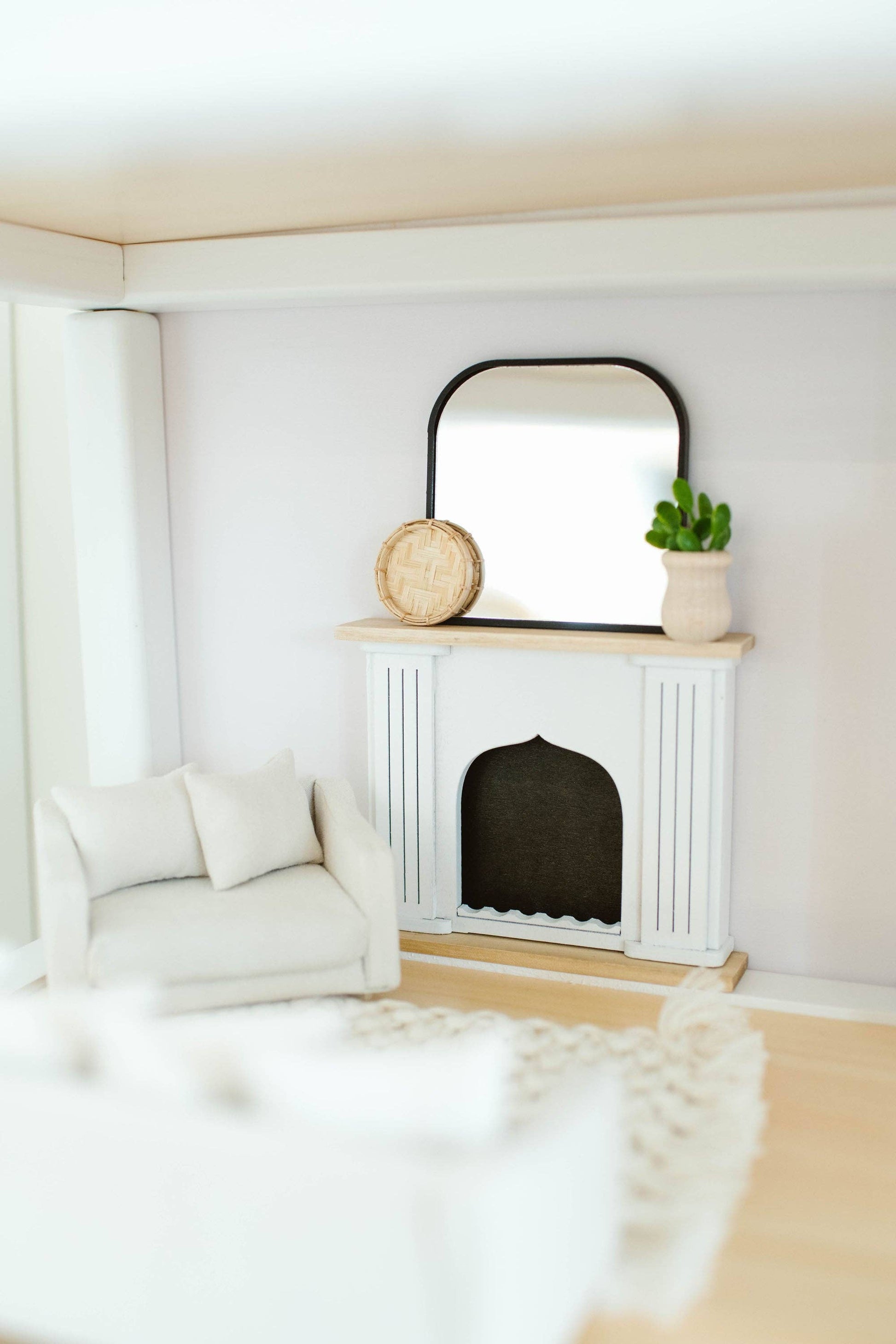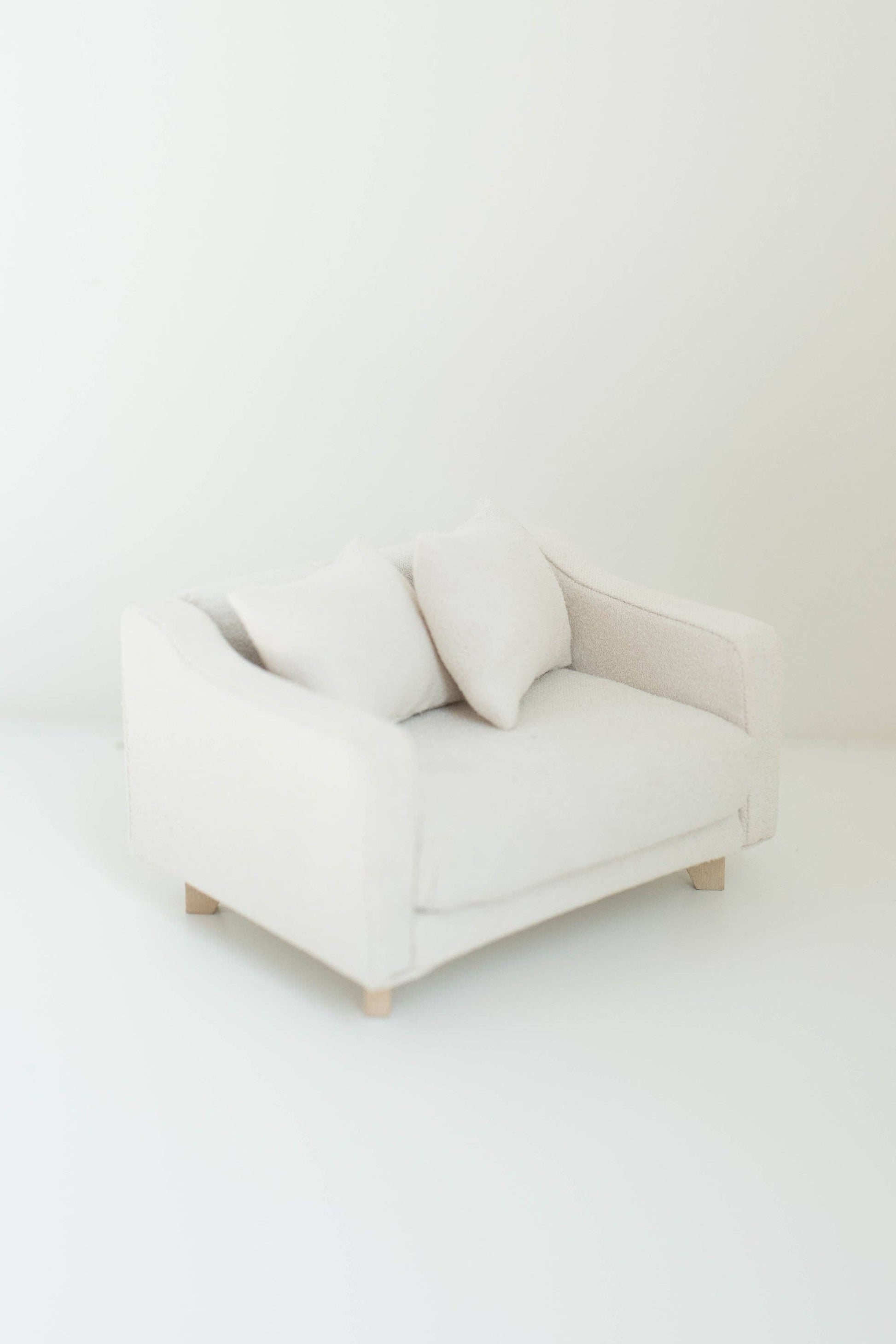 Macy Mae introduces the Adelaide dollhouse living room collection. This chair is a miniature masterpiece that adds elegance and charm to any doll's abode. Crafted with meticulous attention to detail, this miniature chair captures the essence of luxurious living in a compact form. It's soft suede-like fabric is a subtle white color, and matches perfectly to the Adelaide Sofa. The dollhouse chair is made from high-quality materials, ensuring durability and longevity for countless hours of imaginative play. Its frame is skillfully constructed with sturdy wood, providing a solid foundation. The upholstery is delicately hand-sewn, using fine fabrics in a variety of colors and patterns to suit any dollhouse decor.