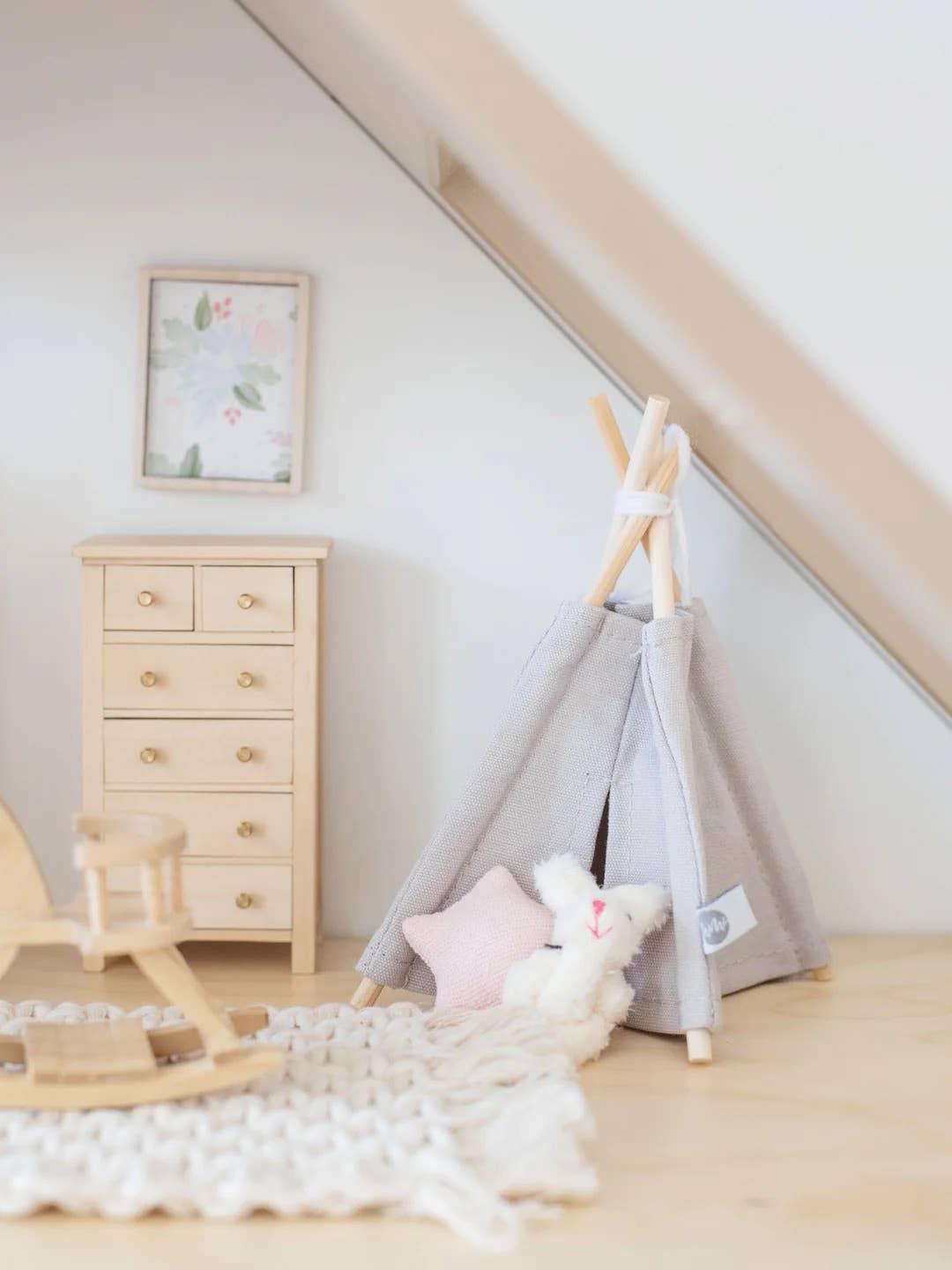 This dresser has striking detail with its natural wood stained base and gold knobs. The 6 drawers leaves plenty of space to store all your tiny things! This pairs perfectly with our bedside table, also with gold knobs. Specifications: Includes: 1 dresser with 6 drawers Scale: 1:12 Measurements: Length: 2.5 in Depth: 1.5 in Height: 4.25 in *All other accessories pictures are sold separately