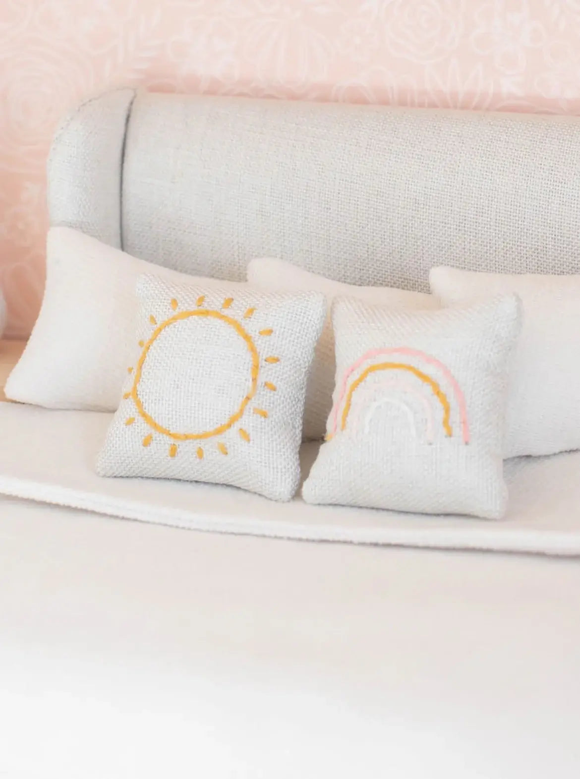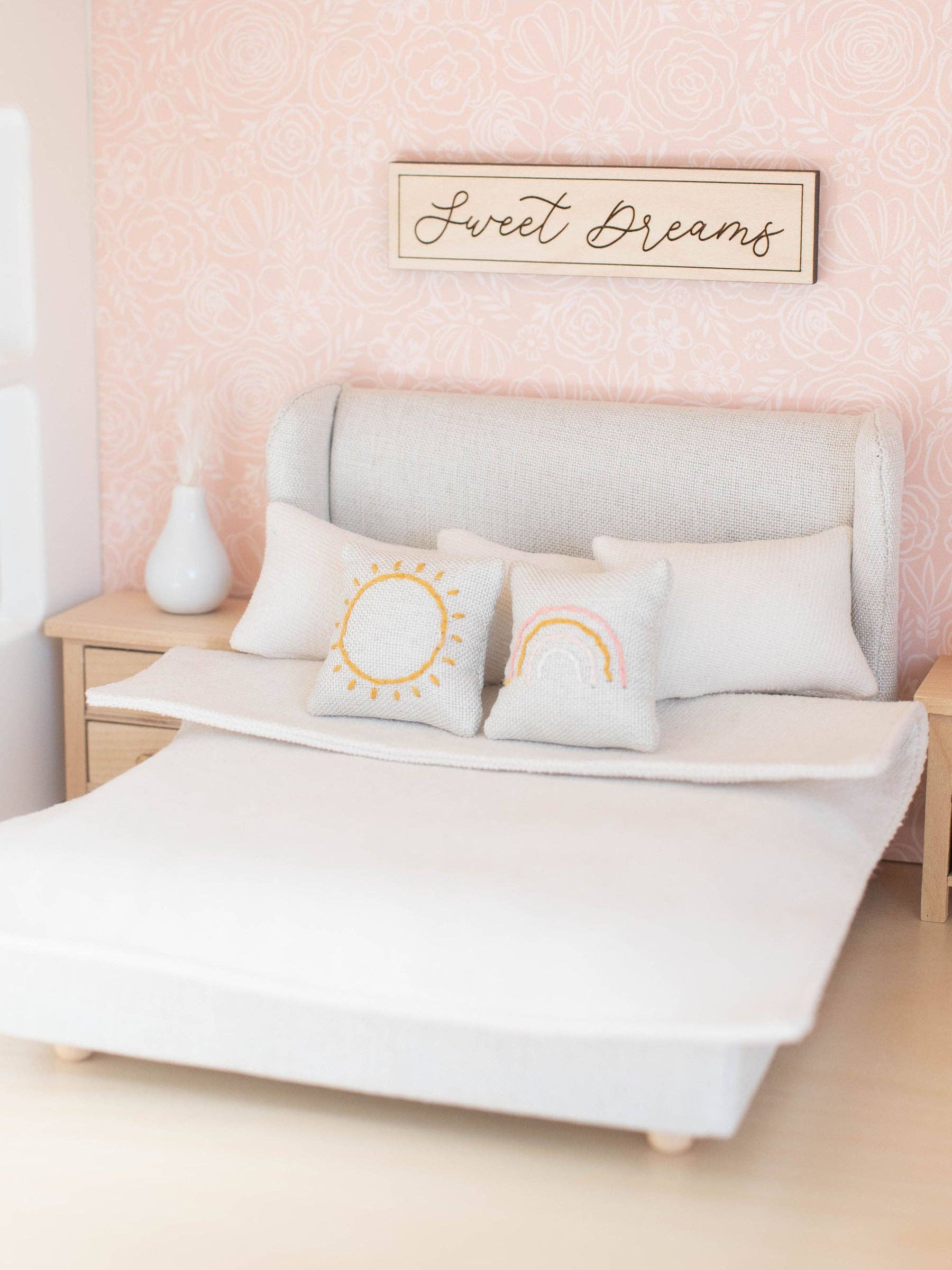 It truly doesn't get more cozy than this! This versatile platform dollhouse bed allows you to get the look you want, from charming to ultra-chic. Designed with sloped wings, this modern miniature bed offers handcrafted quality and designer detail at a great value. Specifications: Includes: 1 double bed with mattress and detachable headboard Scale: 1:12 Measurements: Length: 6.76 in Width: 5.5 in Height: 3.75 in *All other accessories pictured are sold separately.