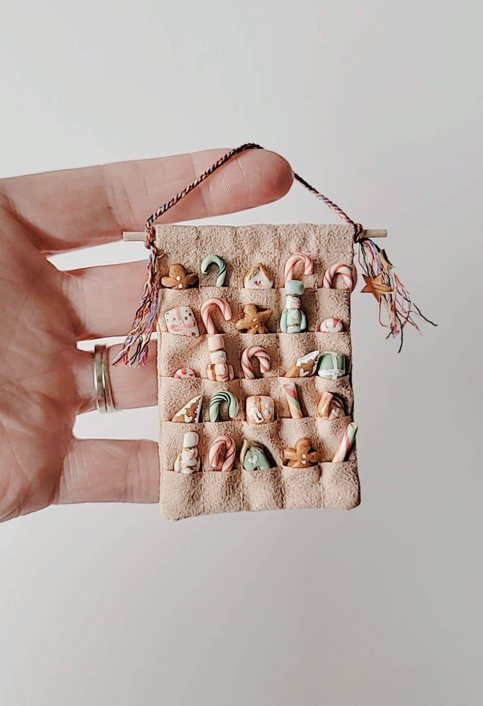Handcrafted with love and ready to store all the tiniest things. Add some itty, bitty clothespins with numbers and you can make your little one’s special days even more special with a countdown. Organizer has 30 pockets, wooden dowel and decorative rope for hanging. Specifications: Includes: 1 wall organizer with NO inserts/filled Completed advent calendar from Buffalo & Bubblegum Scale: 1:12 Measurements: Width: 2 in Height: 2.75 in ***Note*** Accessories pictured are not included. Listing is for wall organizer alone. Advent calendar accessories showcased are made and sold by Buffalo and Bubblegum. Others DIY.