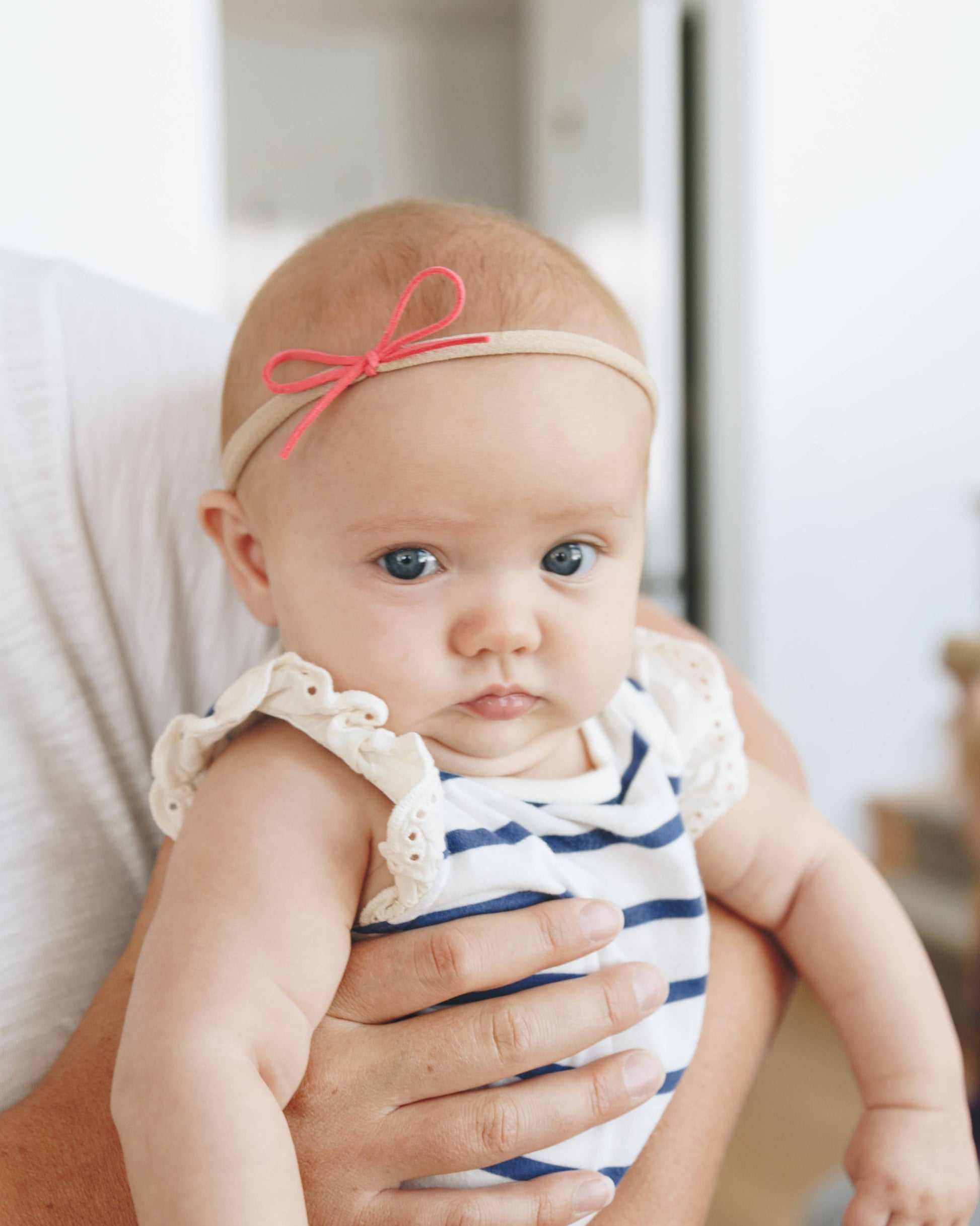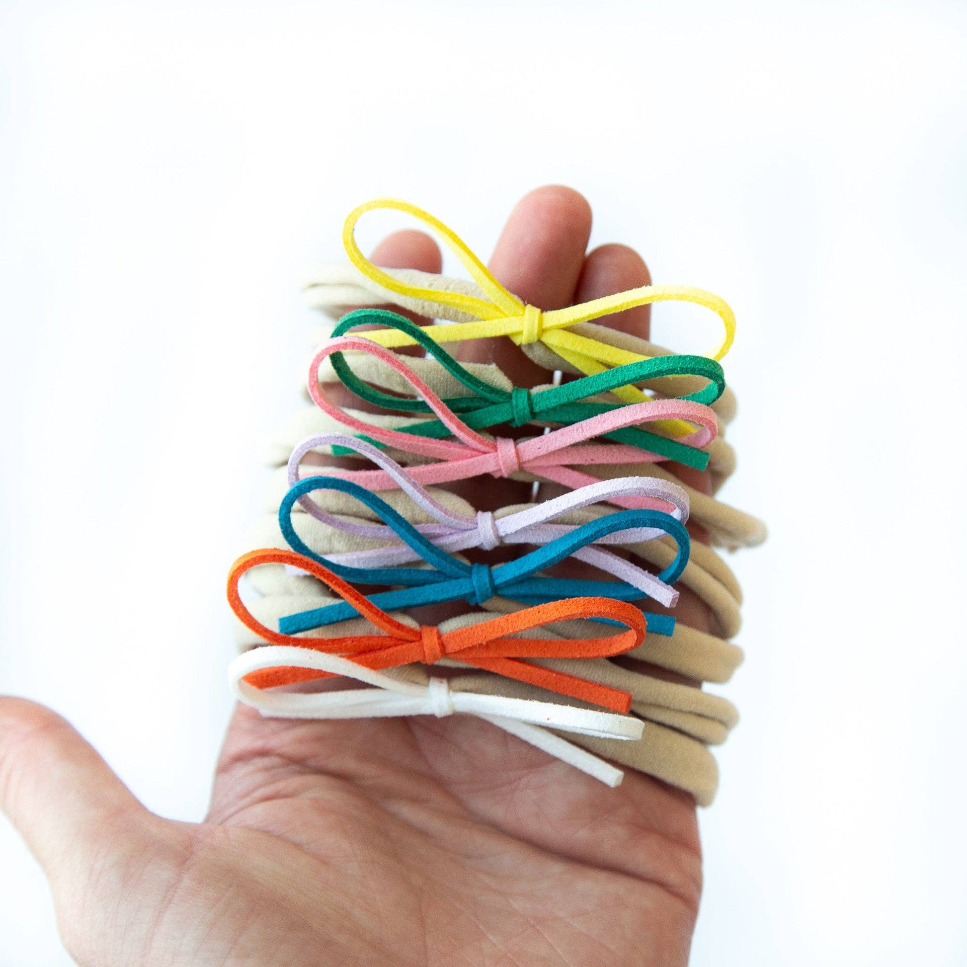 A set of seven sweet and simple bows by Modern Piggy made out of a high-quality faux suede cord and are the perfect size for those tiny newborns Each bow measures approximately 2.5" x 1” and is handmade with love. Nylon headband - This option for your littlest babes and is made out of a soft and stretchy, nude nylon that is gentle on your baby's head. It is one-size-fits-all; no more buying new headbands as they grow. We look forward to seeing your sweet babe wearing #modernpiggy. **Due to the nature of our handmade bows and pattern on the fabric each bow may look slightly different. **Our bows may contain small parts that could potentially be dangerous to small children. Please supervise your child while wearing our bows.