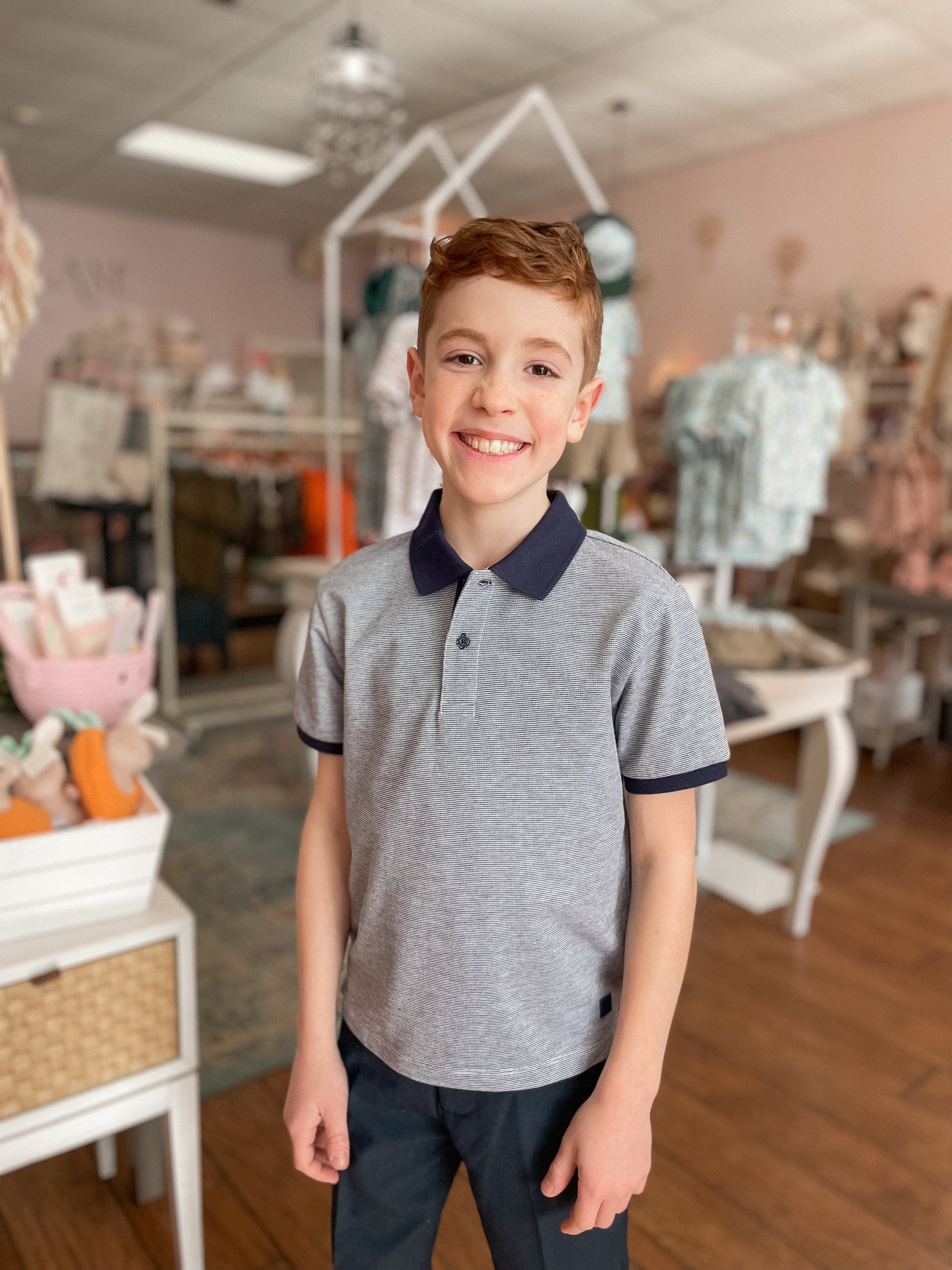 This classic shirt is perfect for a variety of occasions. It is a trim fit, so we recommend sizing up if your child is in-between sizes. It does not have a lot of stretch, so it is a dressier style polo that would be great for photos.