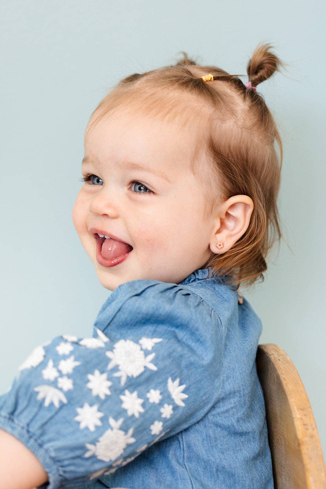 The Petite Flower stud earring is Hypoallergenic 18k gold and pink enamel flower earring with a flat screw back. Designed for babies, toddlers, kids, teens, and adults, these earrings offer fun style and comfort. They are waterproof, tarnish proof and perfect for sensitive ears.