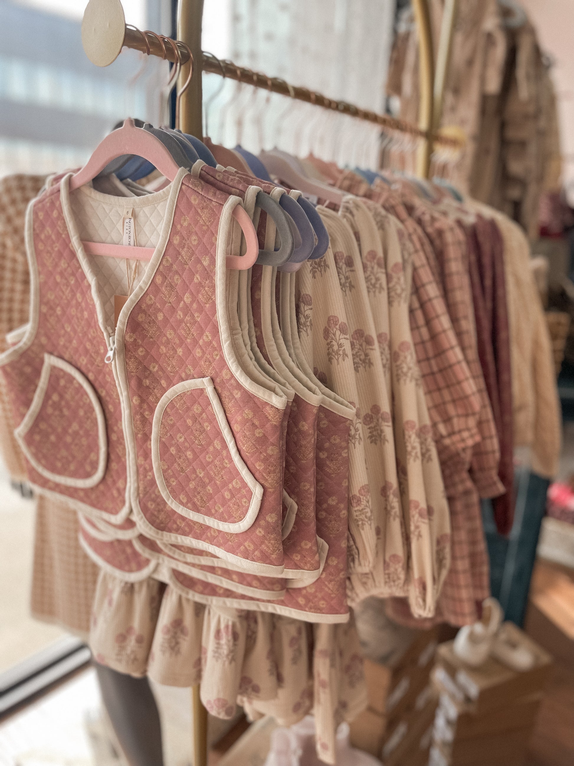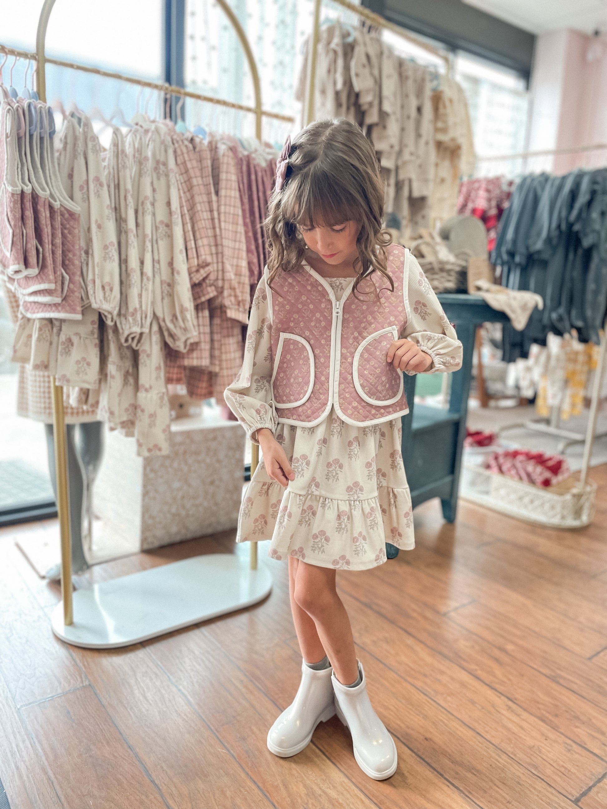 A layering piece with charm and function. This soft quilted vest features a dusty rose print with subtle golden details, finished with contrast trim and oversized pockets. Lightweight yet cozy, it’s perfect for layering over dresses, sweaters, or tops — adding warmth without bulk.