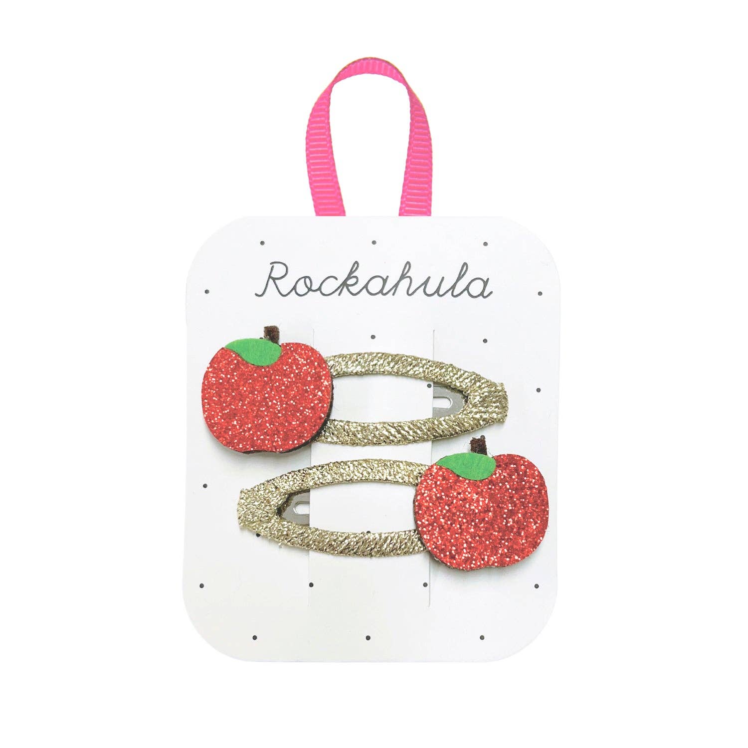 Rockahula Kids - A pack of two rosy red glitter apples, set upon gold ribbon wrapped snap clips. Each little apple is detailed with a little stalk and green leaf. Matching ponies also available. Not suitable for children under 36 months due to small parts. Style code: H2072R