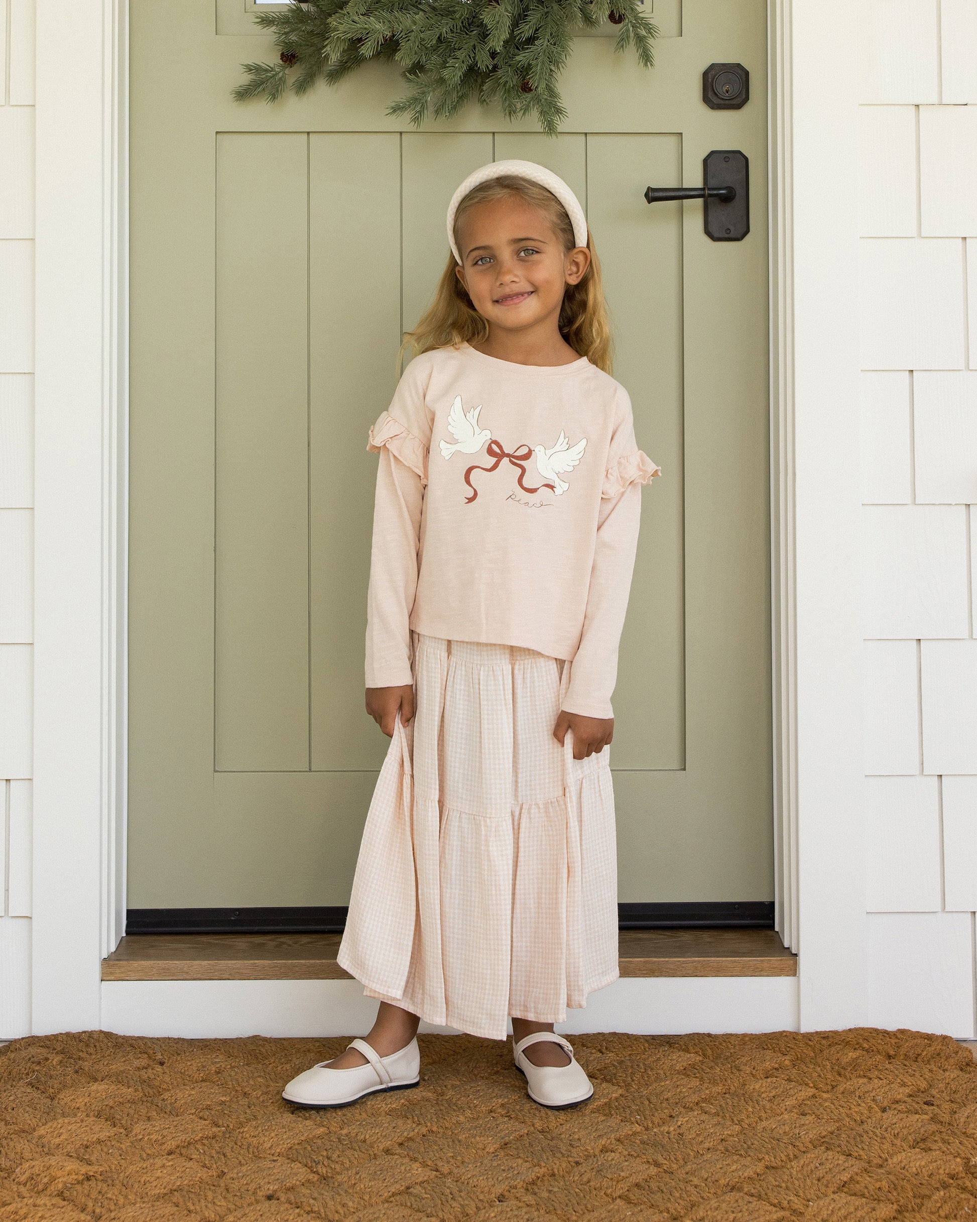 This relaxed-fit long sleeve tee, made from soft cotton jersey, features shoulder ruffles and a gently curved hemline for a sweet look.