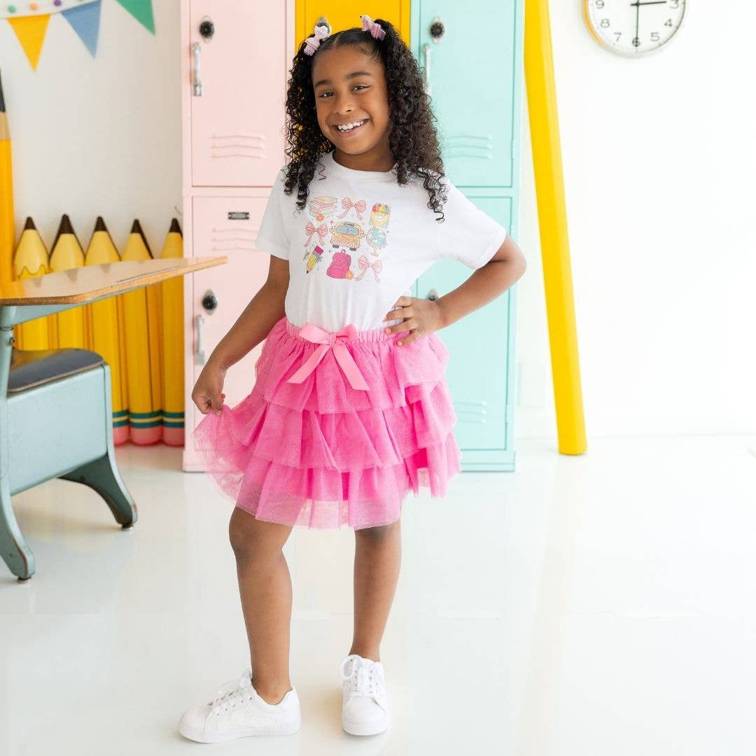The Coquette School Doodle Short Sleeve T-Shirt is a fun and cute t-shirt for kids celebrating back to school! Features: *Shirt Color: White *Graphic Color: Multicolor