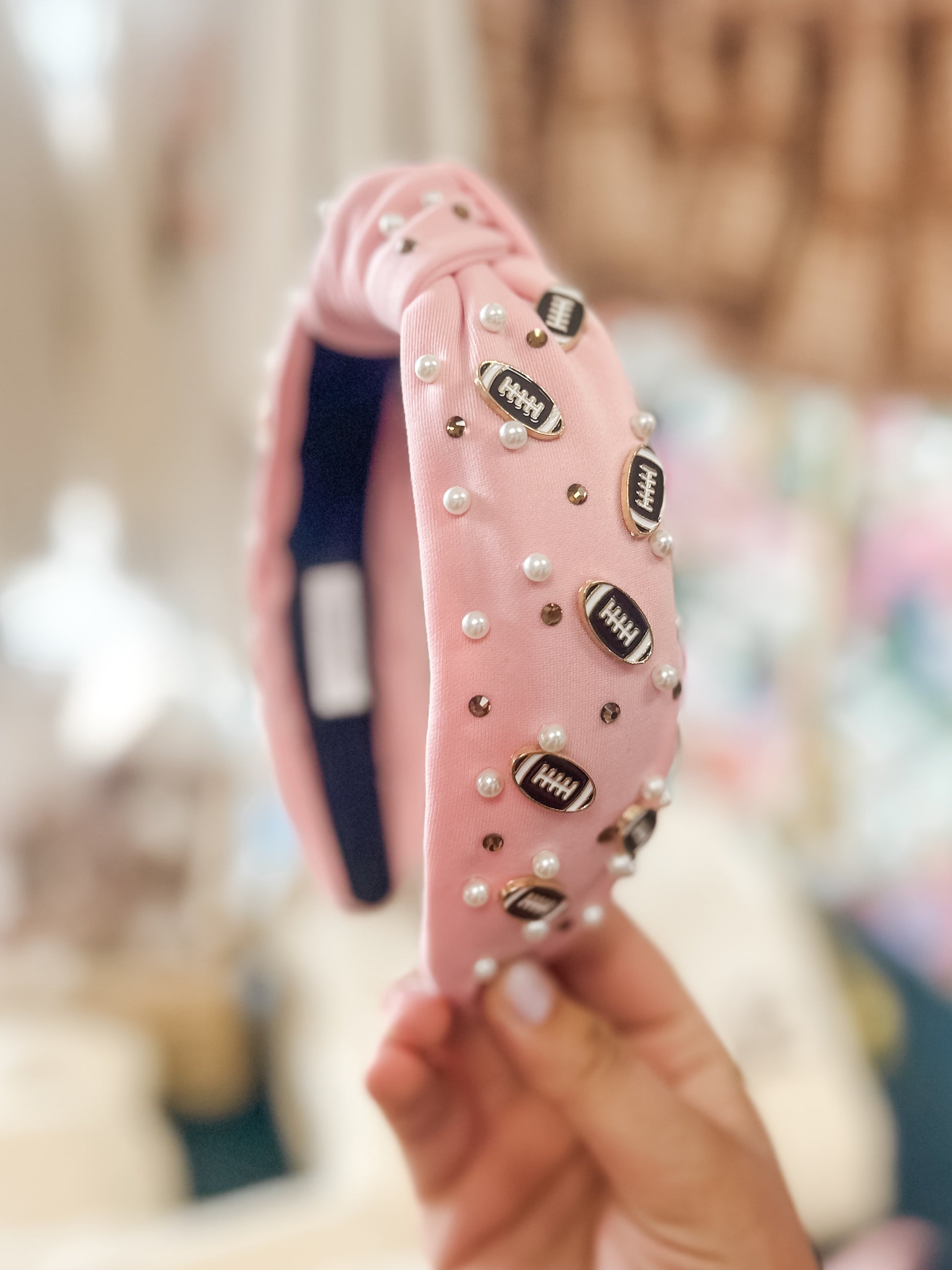 Features: *Pink fabric with football, bow and rhinestone embellishments *Satin lined headband *One size fits all