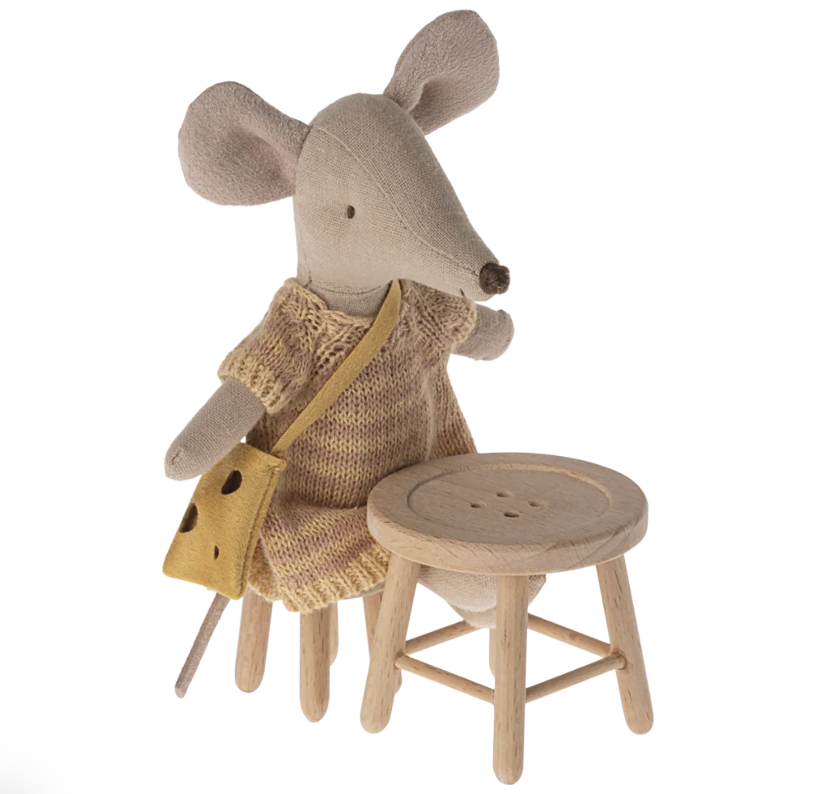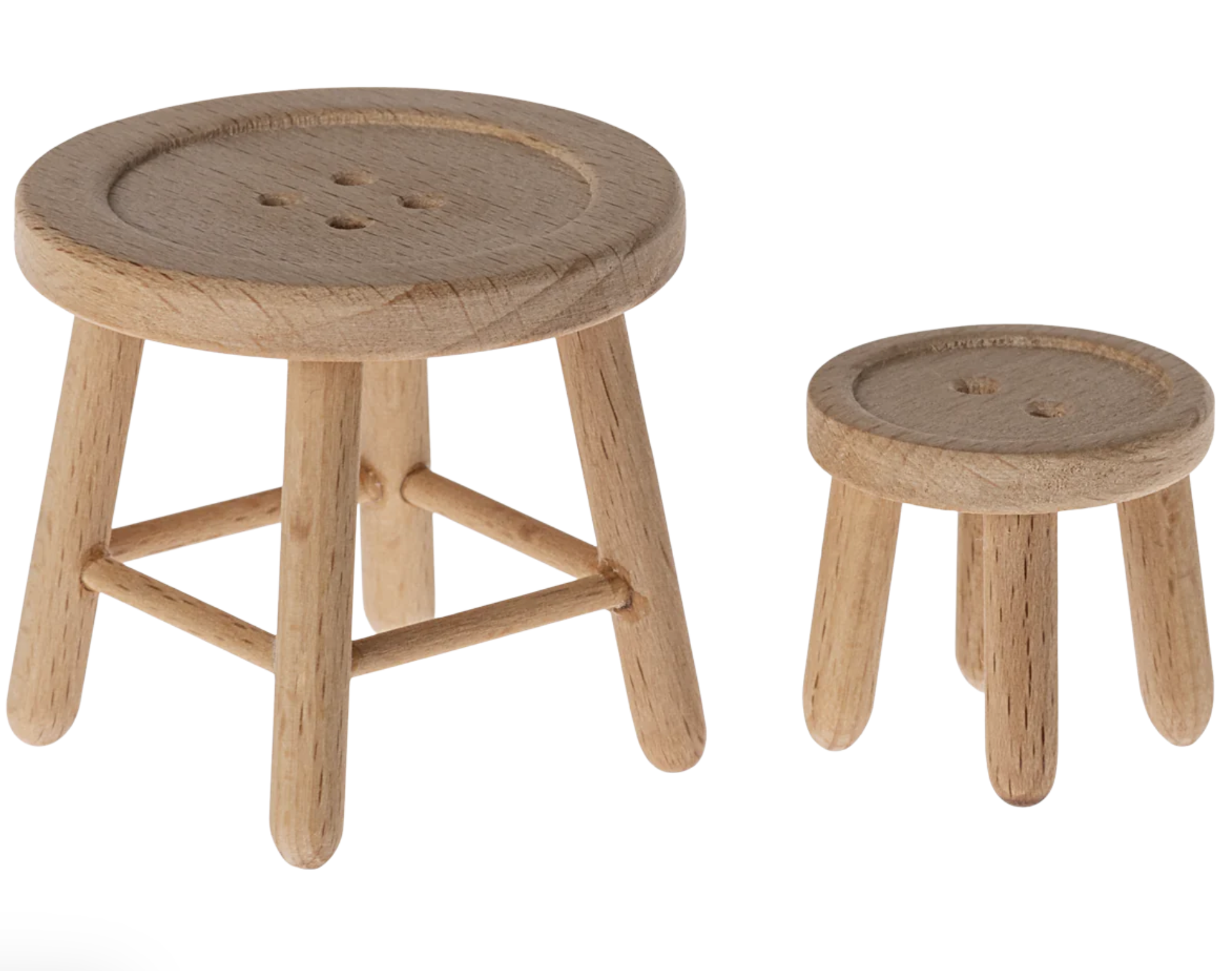 A stool and table set made for the mouse family. It is inspired by buttons and can be mixed with other mice furniture and accessories to create a lovely home. It fits perfectly into the Mouse Hole Farmhouse.
