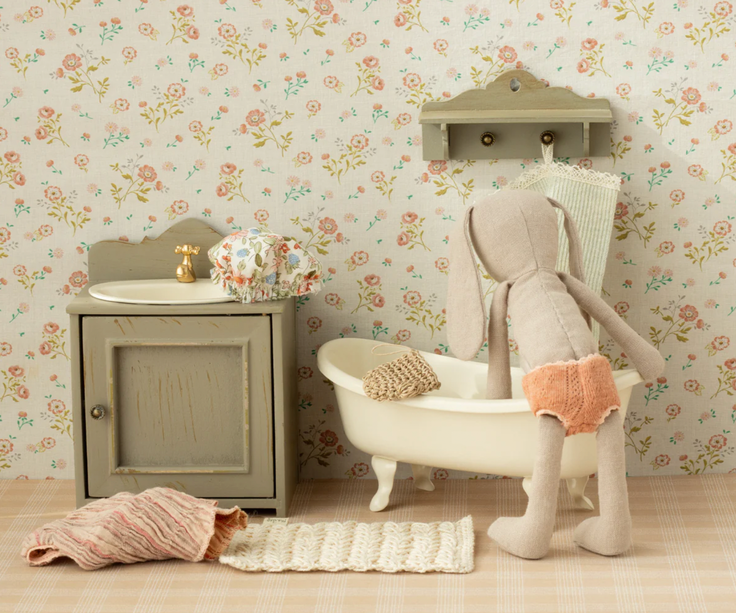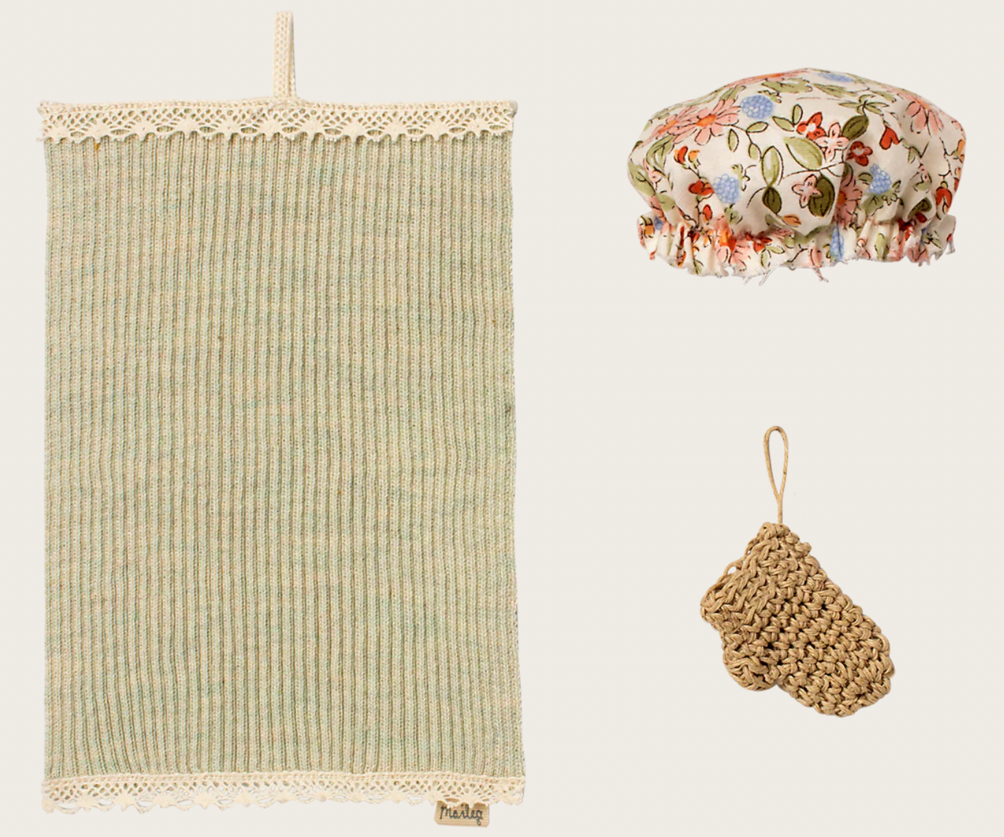 The wellness set comes with a towel, a bathing hat and a bath mitten. The hat and glove fits the Maileg bunnies size 1 & 2 and Teddy family.